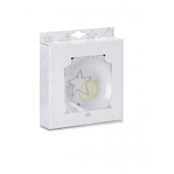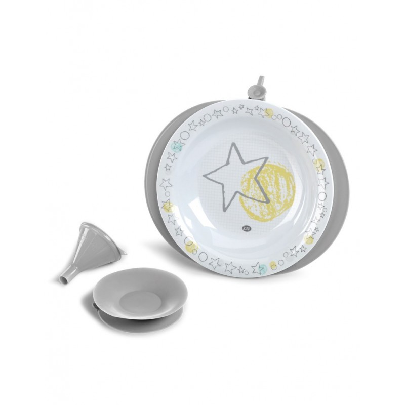 Contém um depósito de plástico que se enche com água quente para manter a temperatura do alimento e uma ventosa para sujeitar o prato à mesa.